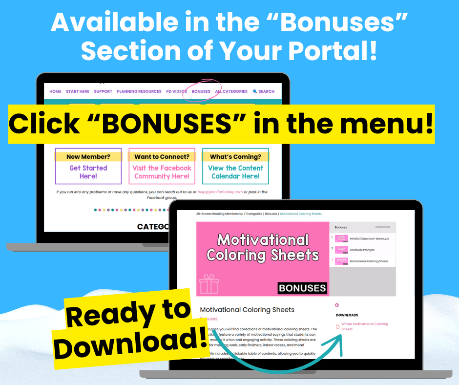 We are excited to bring a mid-month BONUS to you today. We just loaded these exclusive Winter Motivational Coloring Sheets to the membership for you to grab! You can use these as colder weather approaches, and your students start to need a little pep or encouragement.