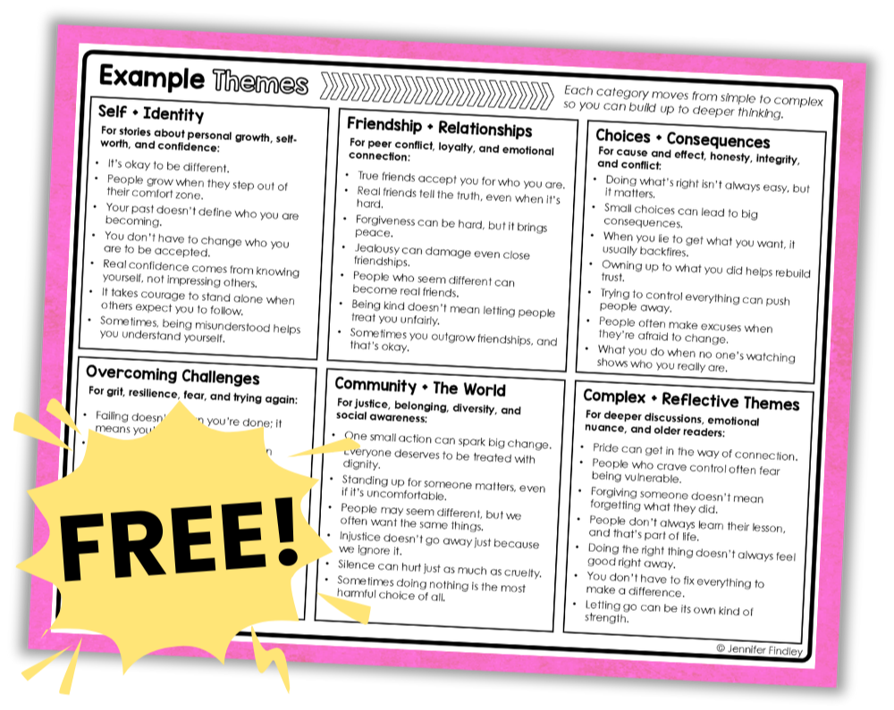 Ready to download and print, the theme bank is organized by category and complexity, so you can build up to deeper thinking.